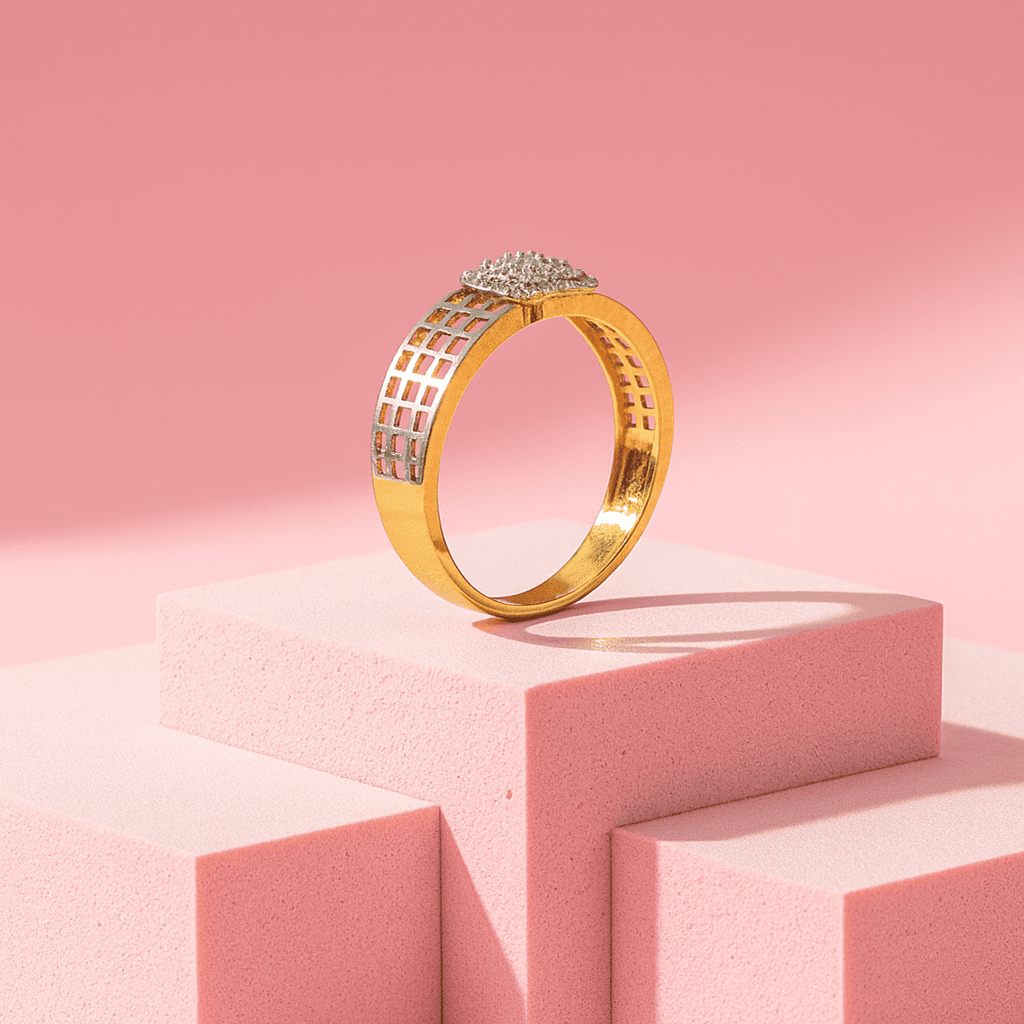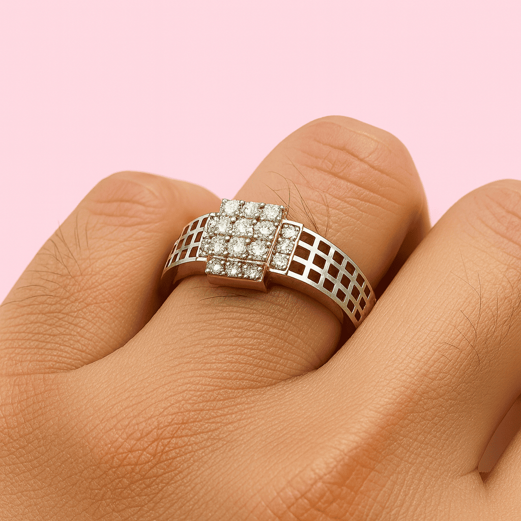 Elevate your style with this contemporary diamond ring, featuring a bold grid-patterned band and a striking cluster of round-cut diamonds at the center. Crafted for the modern man who values luxury with an edge.