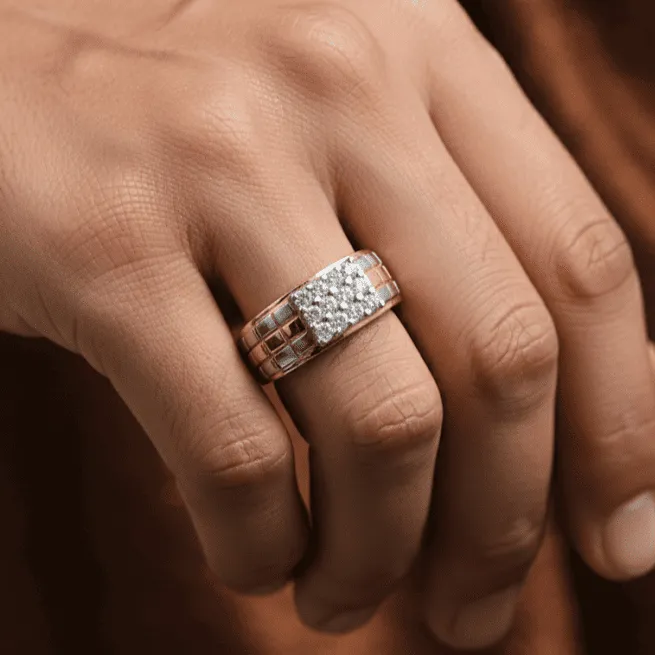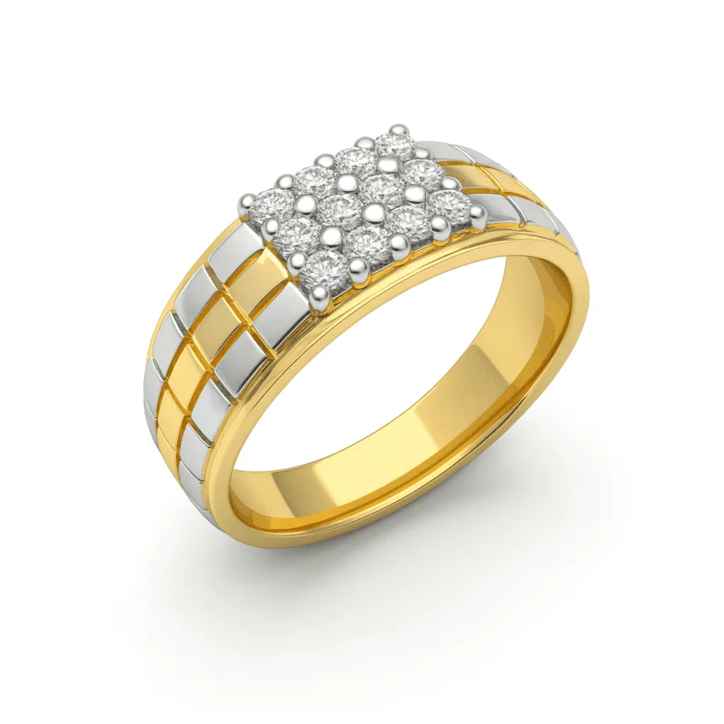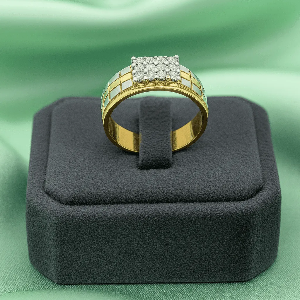 Designer Gents Gold Ring – A bold two-tone gold ring with a geometric patterned band, highlighted by a dazzling square diamond cluster for a modern and luxurious appeal.