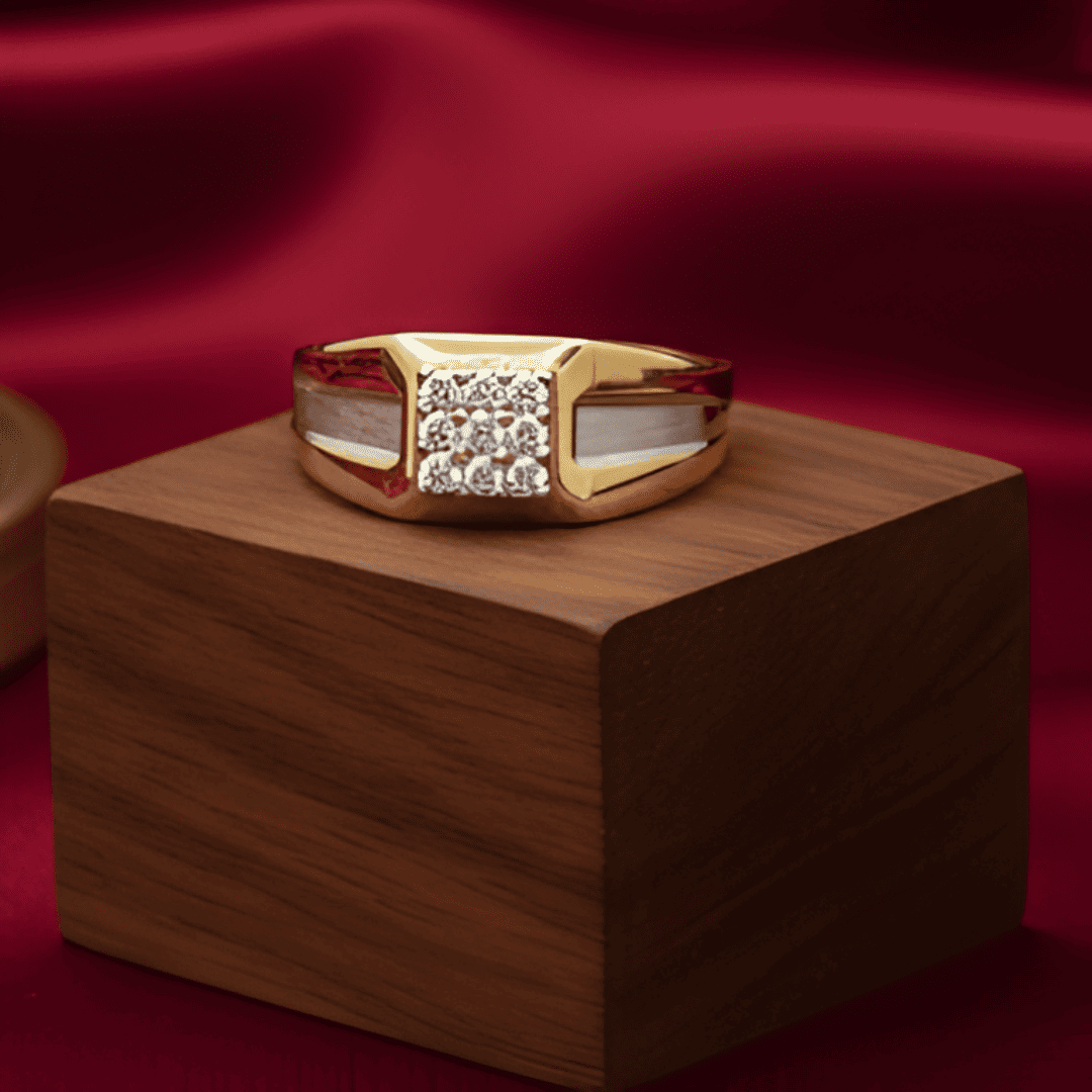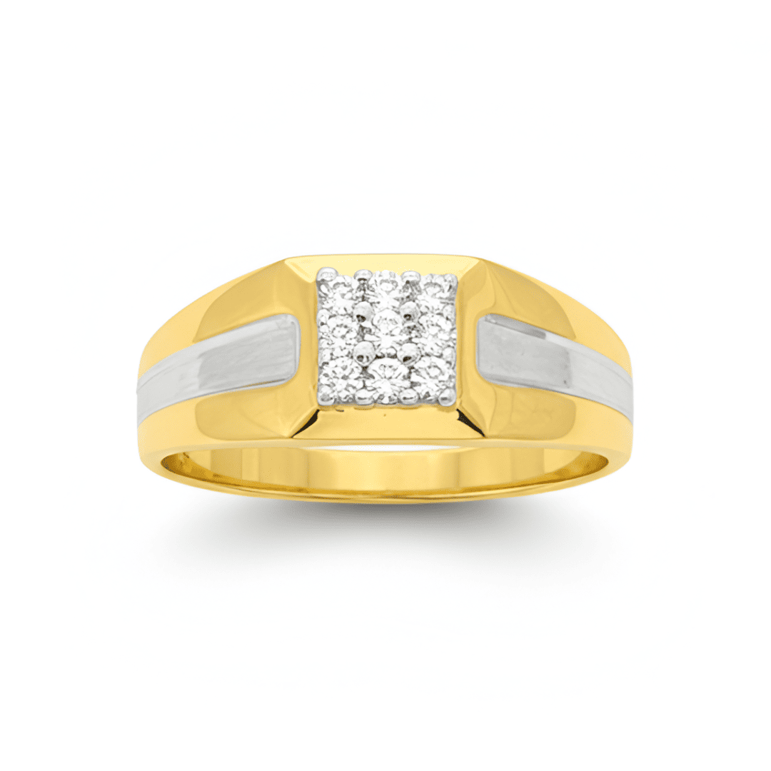 Elegant Two-Tone Gents Ring – A bold gold band with sleek silver inlay on both sides, featuring a radiant square diamond cluster at the center for a refined and powerful look.